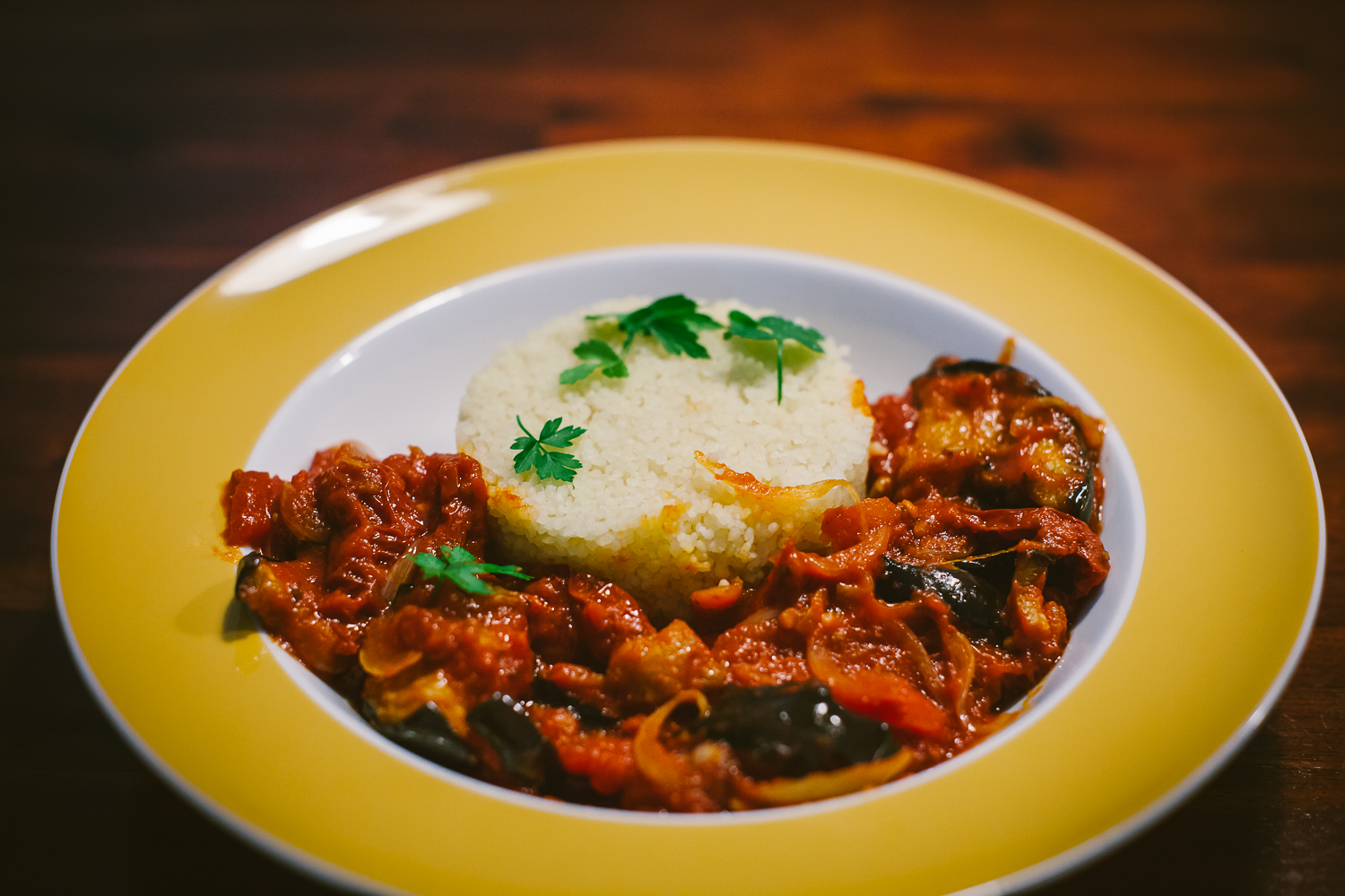 Die Auberginen anschließend zusammen mit den getrockneten Tomaten in die Sauce geben und mit Pfeffer, Zahtar, Tabil, Harissa, Ras el-Hanout, Koriander und Kreuzkümmel je nach Geschmack würzen und noch einmal 10 Minuten bei schwacher Hitze köcheln lassen.