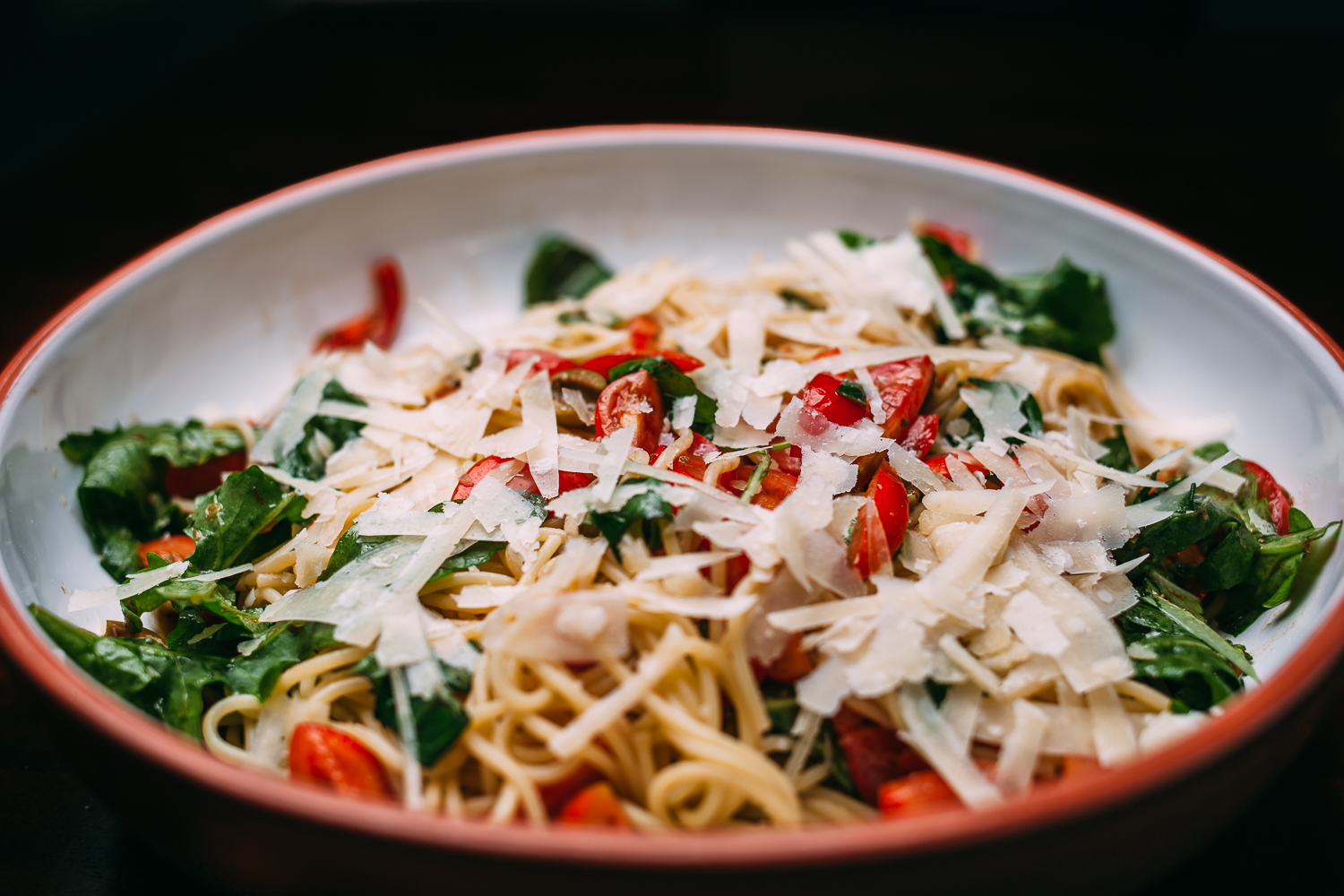 Spaghetti kochen, in der Zeit alles andere waschen und klein schippeln. Kalt alle Zutaten zusammen mischen, Nudeln abgießen und mit den anderen Zutaten in einem großen Teller mischen, Parmesan darüber reiben und genießen! 🙂