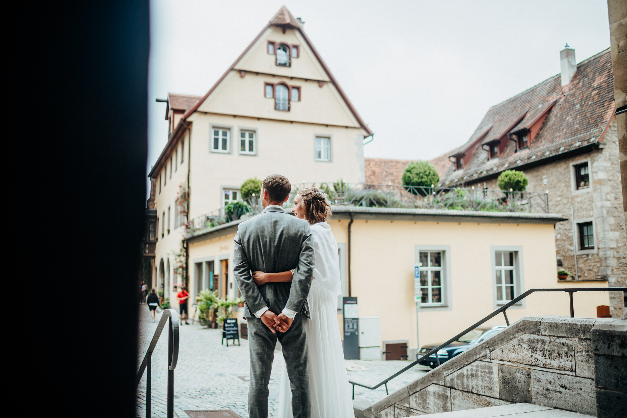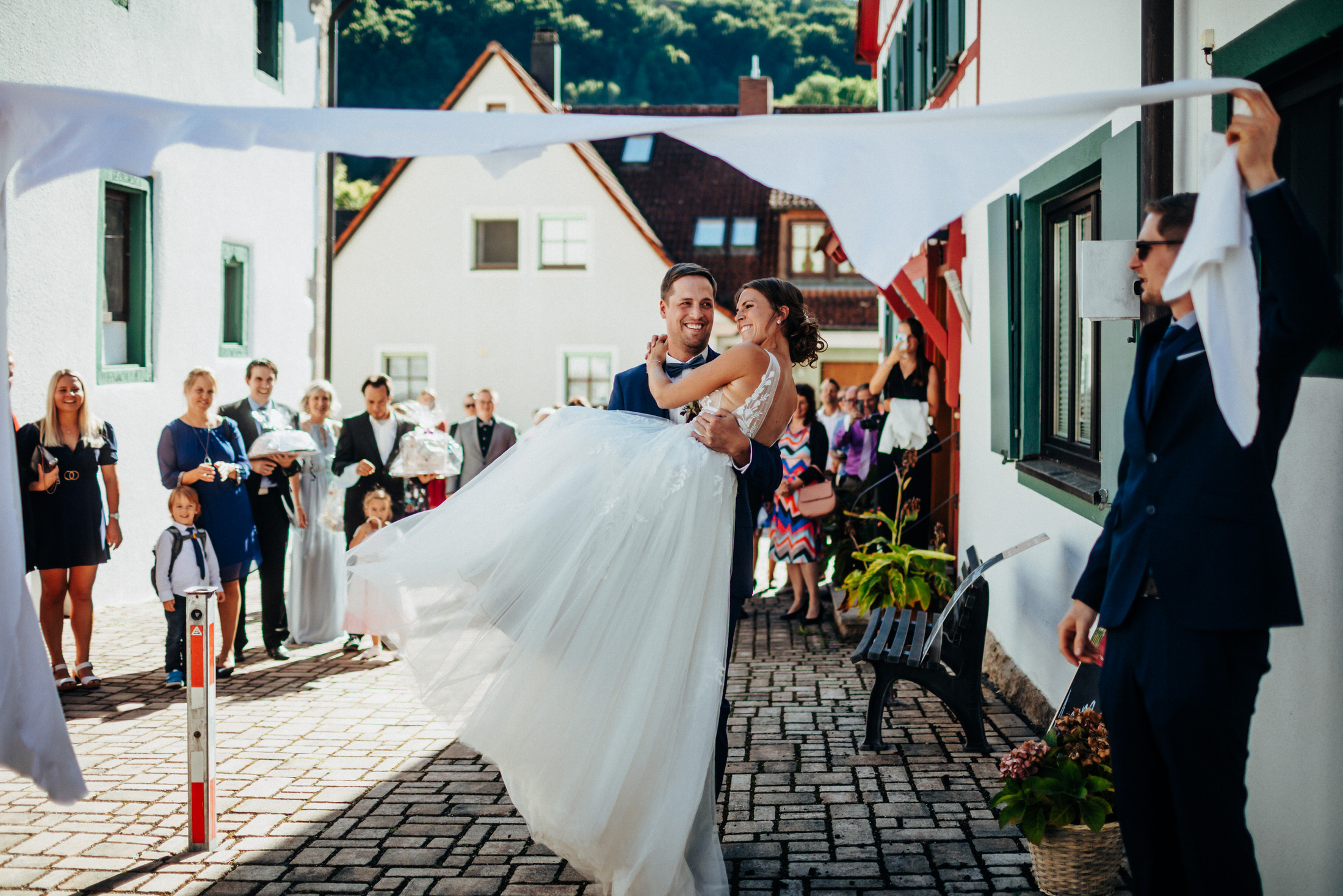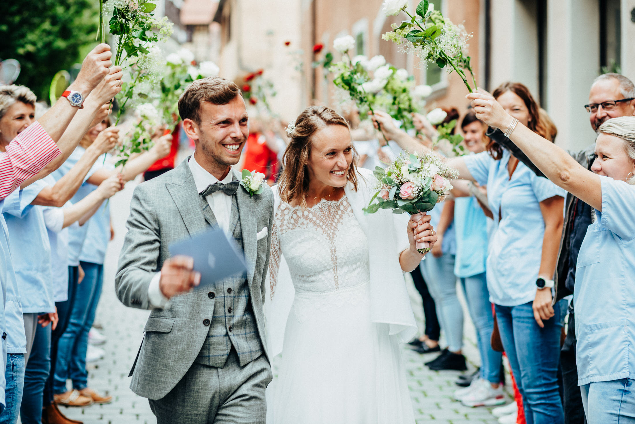 Elli und Benni heirateten auch im Juli. Ihre kirchliche Trauung fand in der Jakobskirche in Rothenburg statt. Nach ihrer Vermählung mit einigen Gänsehautmomenten warteten dann viele Leute zum Spalierstehen und gratulieren. Nach einem Imbiss und Umtrunk ging es ins Wildbad zur Feier.