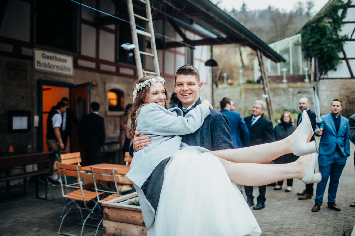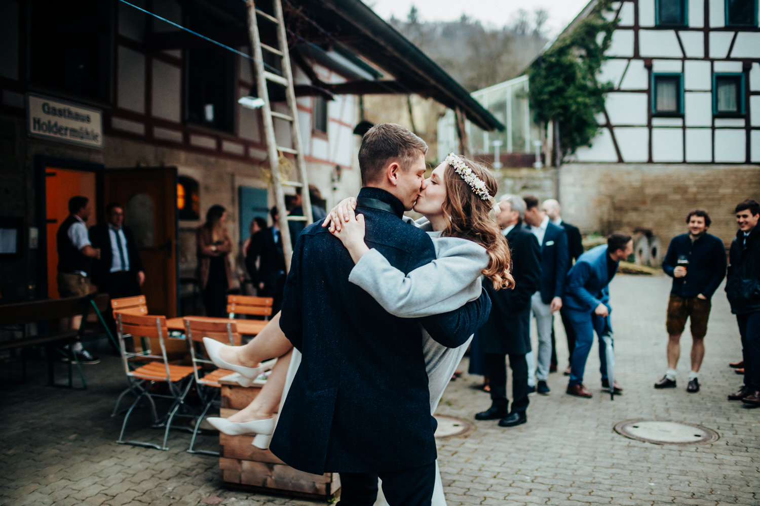 Nach einer kleinen Stärkung mit Kaffee und Kuchen wurde die Braut in die Holdermühle entführt. Bei Sekt und Bier dauerte es nicht lange, bis die Stimmung dank der Band Hally Gally auf dem Höhepunkt war! 🙂