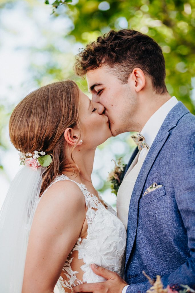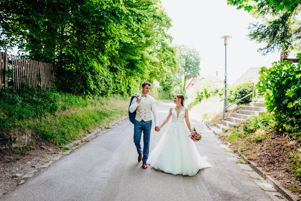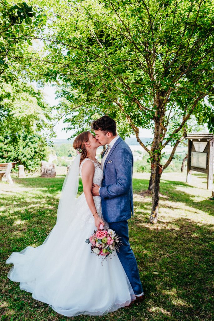 Nadja & Josch hatten auch einen First Look vor ihrer standesamtlichen Hochzeit geplant. Hierfür holte ich Josch und seinen Trauzeugen morgens daheim ab und wir fuhren zusammen zum Brunnenhaus in Schillingsfürst. Dort konnte ich dann erste Bilder von den beiden machen bis Nadja (begleitet durch ihre Trauzeugin und ihren Vater) im Käfer eintraf. Nachdem die Sonne an diesem wunderschönen Juni-Tag bereits sehr hoch stand wählte ich einen schattigen Platz unter Bäumen.