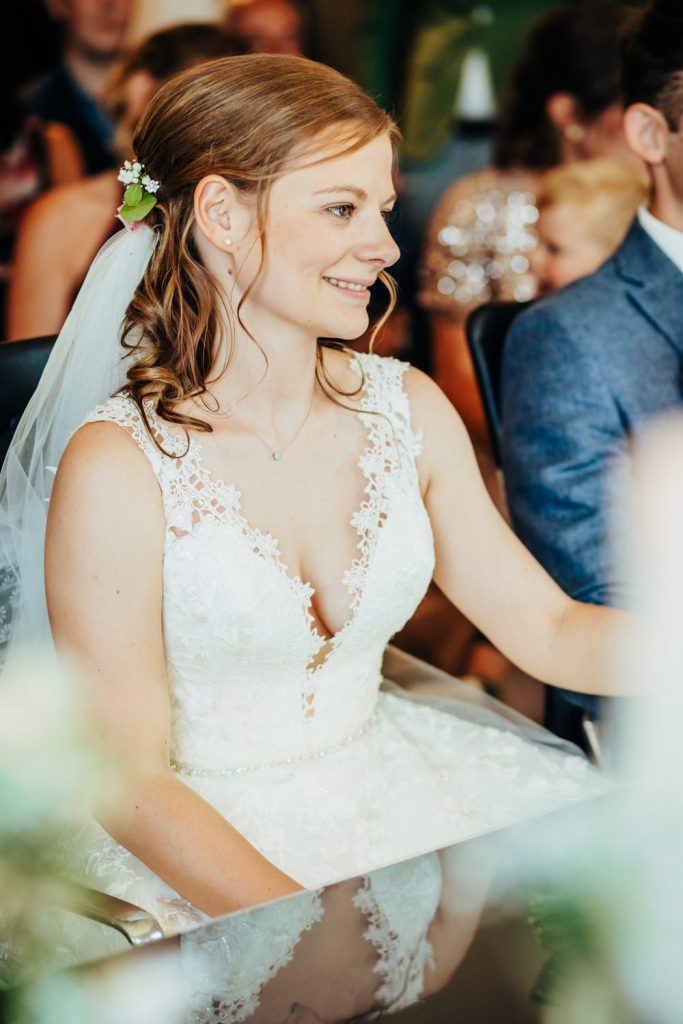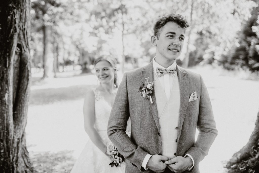 Ich finde diesen Moment immer sehr besonders und so wichtig, dass ich allen Brautpaaren im Vorgespräch dazu rate diesen Moment bildlich festhalten zu lassen. Wenn der Bräutigam seine Braut das erste Mal im Kleid sieht, funkeln die Augen und die erste Anspannung scheint erst mal verflogen! Auch für die Bräute ist es meist ein ganz spezieller Moment, einerseits weil sie ihren Partner zum ersten Mal im Outfit sehen und natürlich auch auf deren Reaktion gespannt sind. Alternativ kann man natürlich auch einen First Look mit dem Brautvater und der Brautmutter (wenn sie nicht beim Ankleiden dabei ist) oder den Großeltern planen. Es ist einfach ein sehr schöner und bewegender Moment für alle. 🙂
