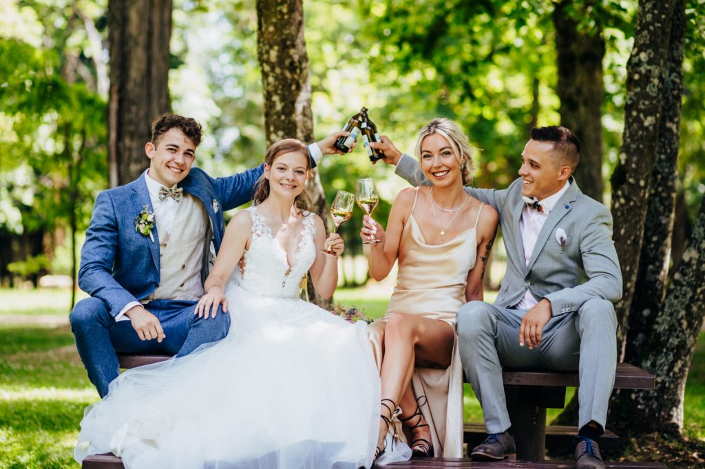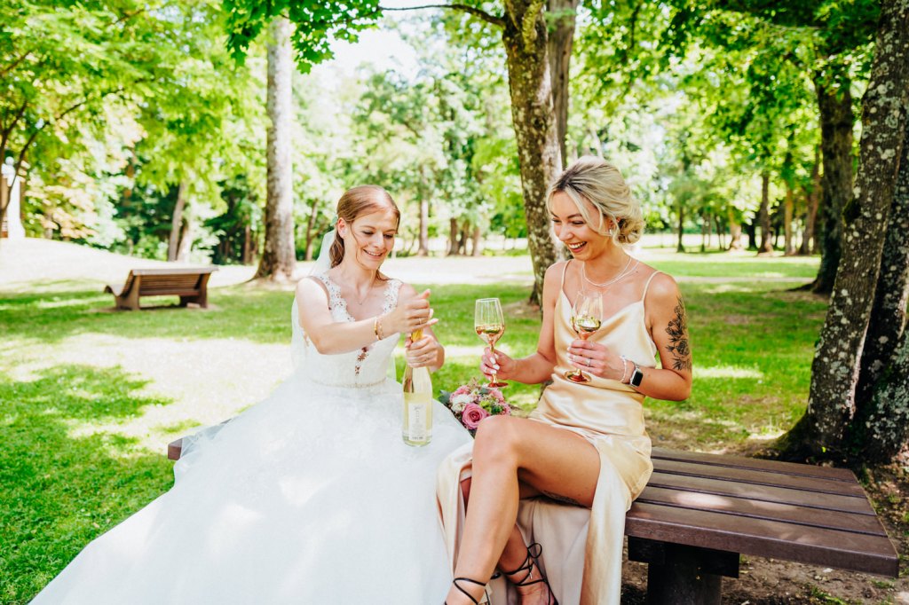 Nach ein paar Bildern im Schlosspark hatten sich die beiden ein paar Getränke mit ihren Trauzeugen redlich verdient! 🙂 So ließen die beiden die (Kron-)Korken knallen und sich das gut gekühlte Getränk schmecken, bevor es weiter ging.