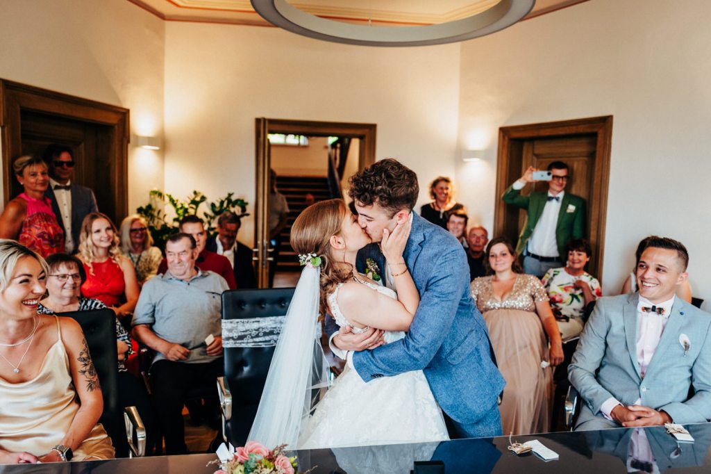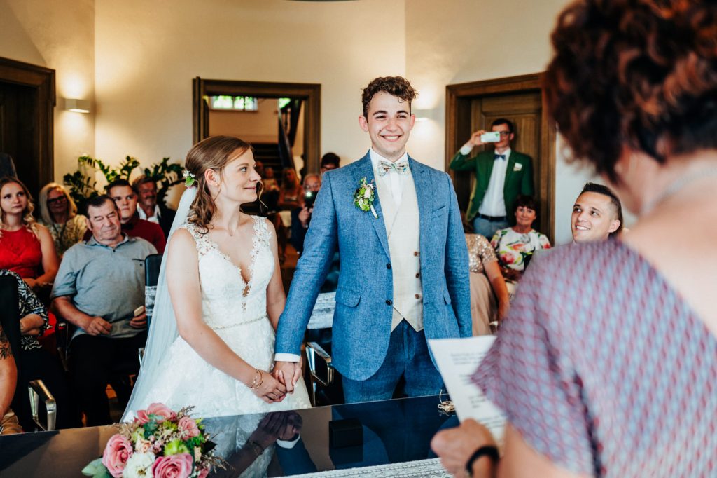 An der Villa Roth in Schillingsfürst warteten bereits die ersten Gäste und die Anspannung stieg wieder etwas. Josch begrüßte die Gäste während sich Nadja bis zur Trauung zurückzog, um nicht vorab von der Hochzeitsgesellschaft gesehen zu werden. Als Nadja dann zu den Klängen der Band in das Trauzimmer einlief, flossen bereits die ersten Tränen bei vielen Anwesenden – kein Wunder bei so einem wunderschönen Outfit! Die Eheschließung war sehr emotional für beide und wirklich schön. Auch Josch’s Vater lies sich die Gelegenheit nicht nehmen und hatte ein paar Worte für die beiden vorbereitet.