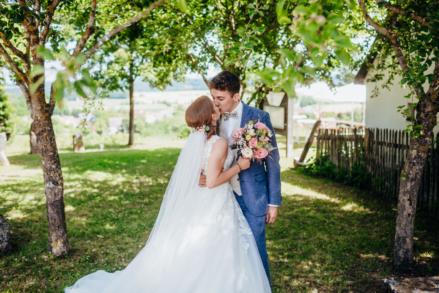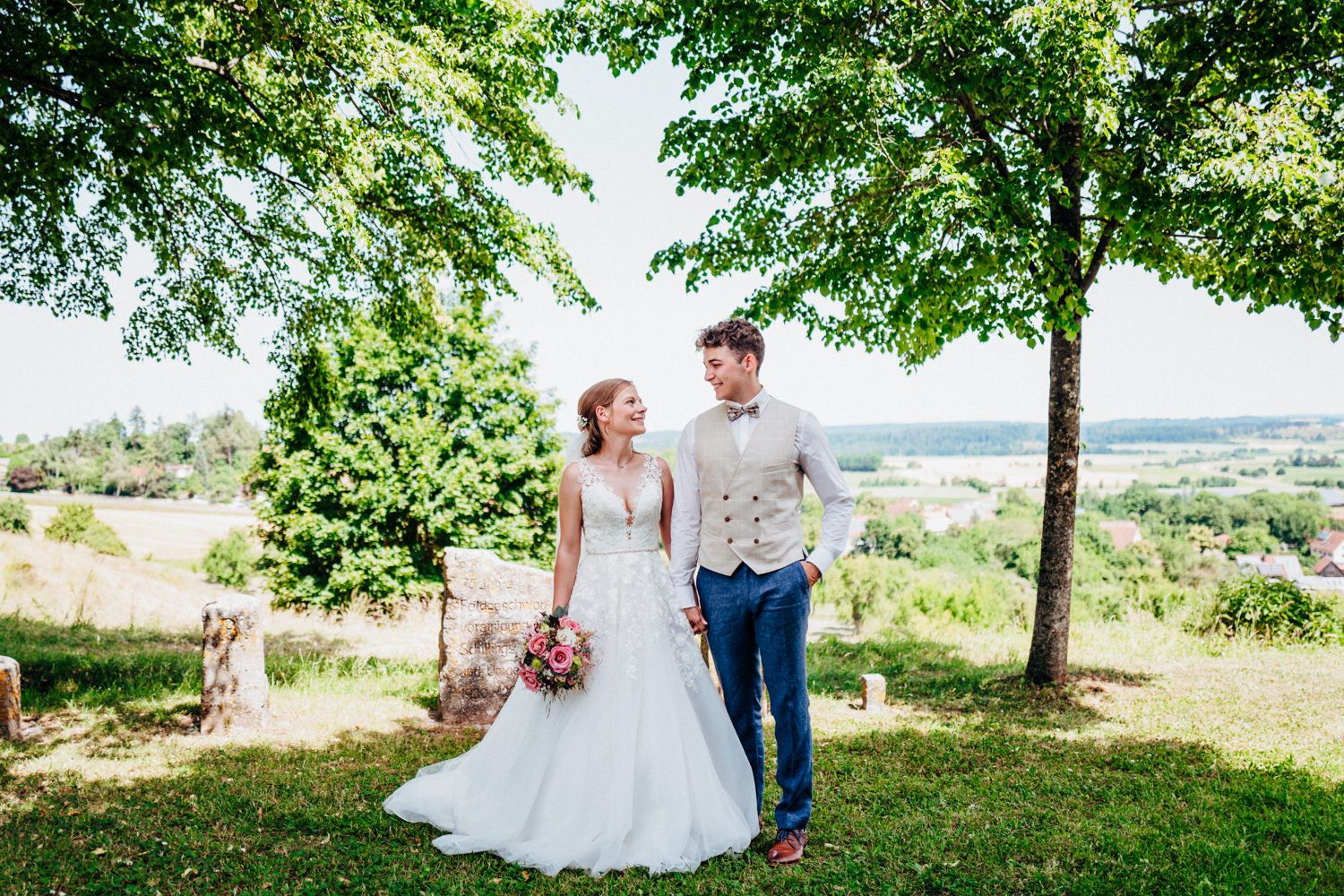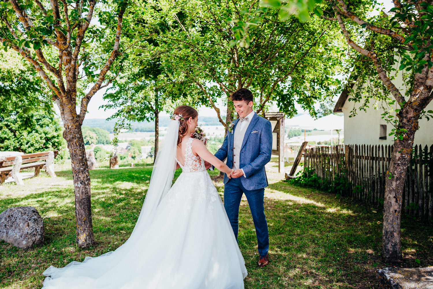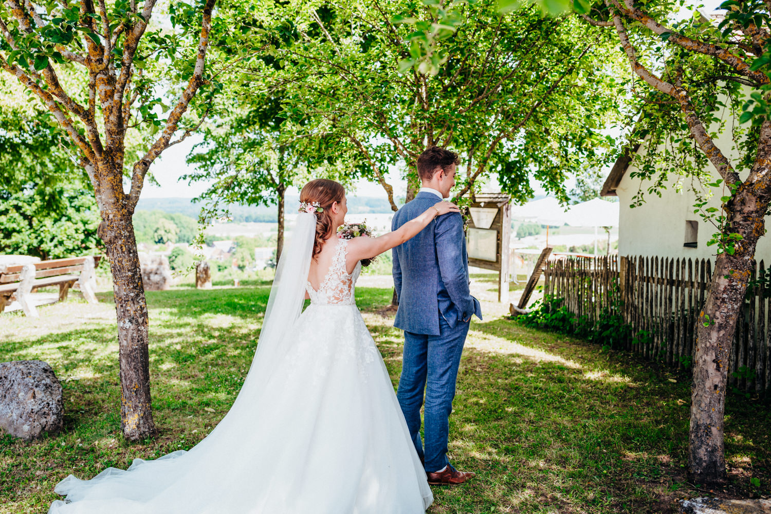 Nadja & Josch hatten auch einen First Look vor ihrer standesamtlichen Hochzeit geplant. Hierfür holte ich Josch und seinen Trauzeugen morgens daheim ab und wir fuhren zusammen zum Brunnenhaus in Schillingsfürst. Dort konnte ich dann erste Bilder von den beiden machen bis Nadja (begleitet durch ihre Trauzeugin und ihren Vater) im Käfer eintraf. Nachdem die Sonne an diesem wunderschönen Juni-Tag bereits sehr hoch stand wählte ich einen schattigen Platz unter Bäumen.