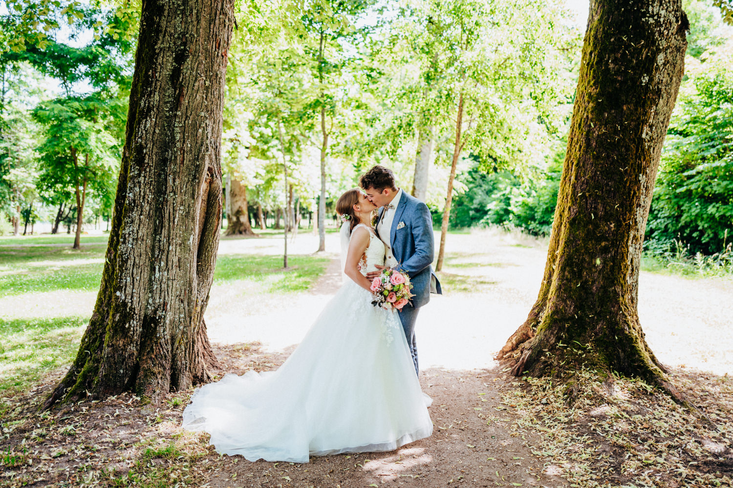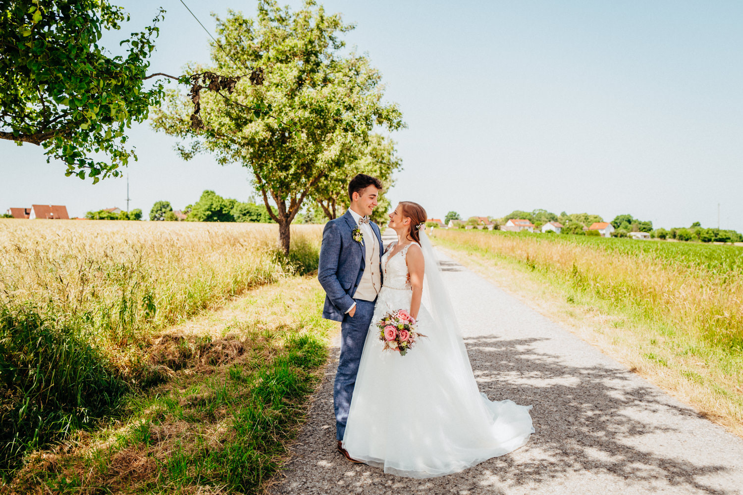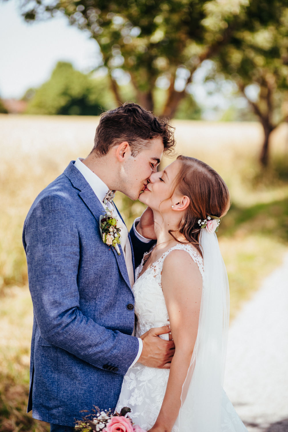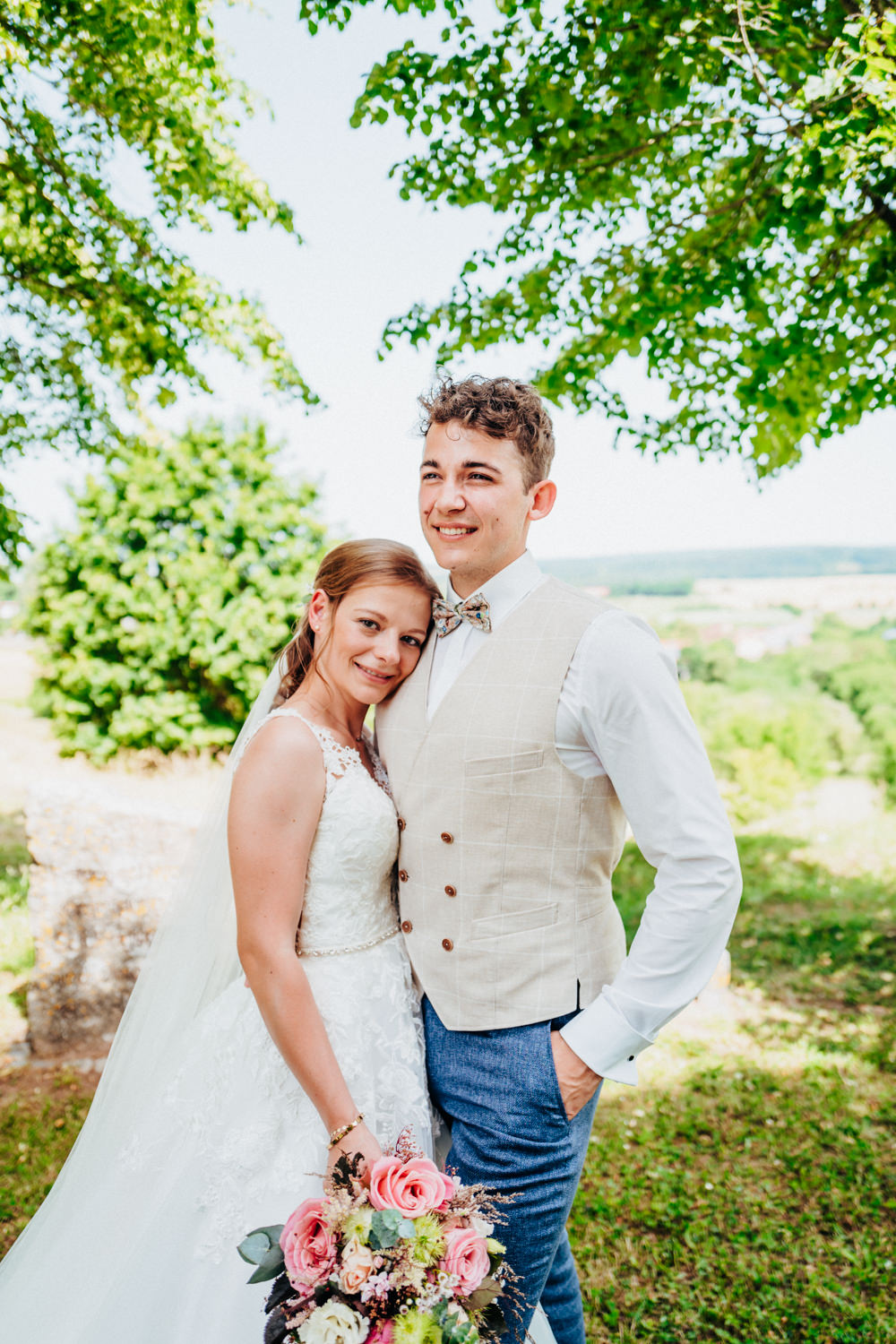 Nadja & Josch hatten auch einen First Look vor ihrer standesamtlichen Hochzeit geplant. Hierfür holte ich Josch und seinen Trauzeugen morgens daheim ab und wir fuhren zusammen zum Brunnenhaus in Schillingsfürst. Dort konnte ich dann erste Bilder von den beiden machen bis Nadja (begleitet durch ihre Trauzeugin und ihren Vater) im Käfer eintraf. Nachdem die Sonne an diesem wunderschönen Juni-Tag bereits sehr hoch stand wählte ich einen schattigen Platz unter Bäumen.