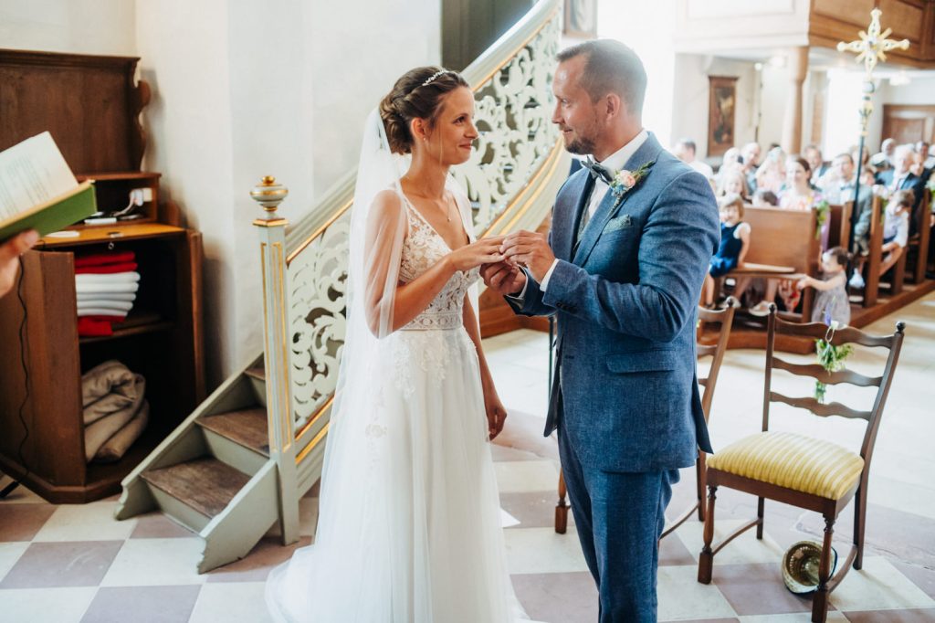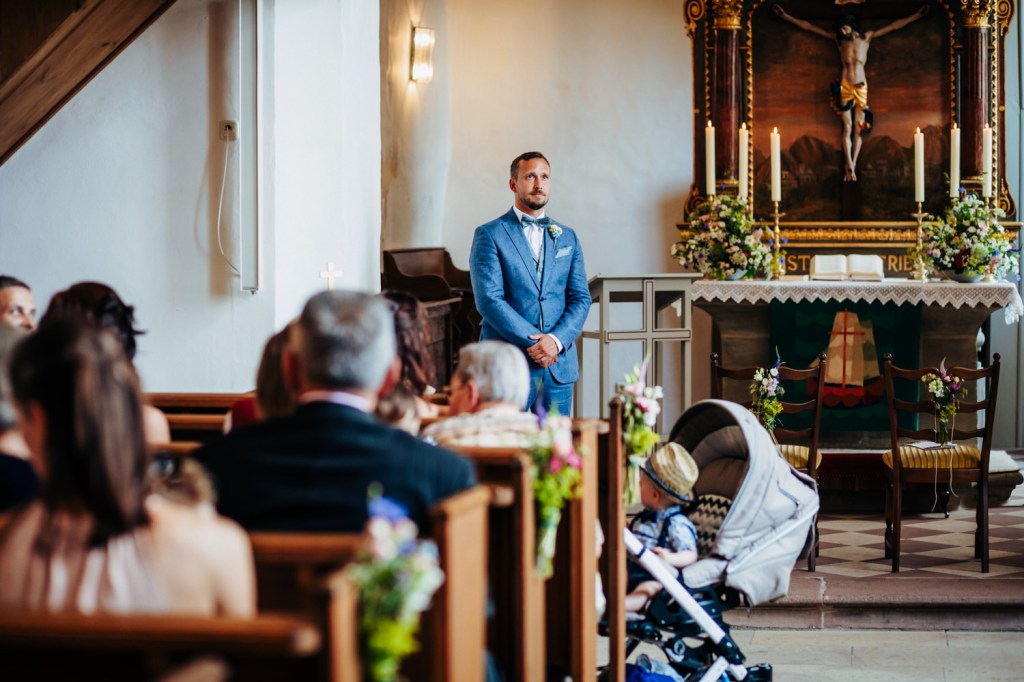 Nachdem die beiden sich erst vor dem Altar das erste Mal sehen wollten, entfiel diesmal der First Look. Michi empfing die zahlreichen Gäste an der Kirche in Insingen und positionierte sich, als es Zeit wurde vorne in der Kirche, während Jana mit ihrem Vater unterhalb des Vorplatzes mit dem Auto ankam. Die Nervosität war deutlich zu spüren als sie mit ihrem Papa die Kapelle betrat.