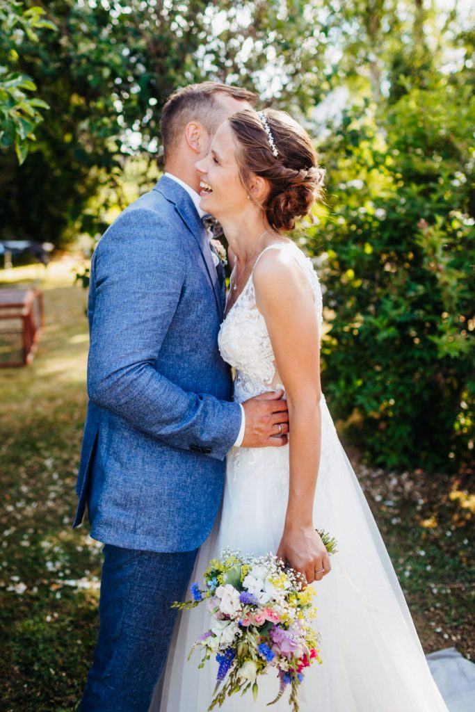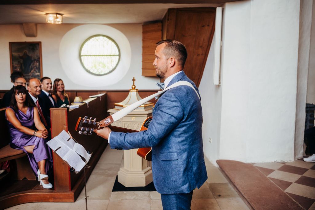 Nach der Trauung und Ringübergabe und Liedern des Losen Haufens folgte dann noch ein weiteres Highlight: Michi schnappte sich überraschend die Gitarre und spielte begleitet von Tuba, Quetsche und Cajón das Lied „Ehrenwort“ von Fäaschtbänkler. Die Herzen der anwesenden Frauen schmolzen und der ein oder andere konnten sich ein paar Tränen nicht verkneifen. 🙂