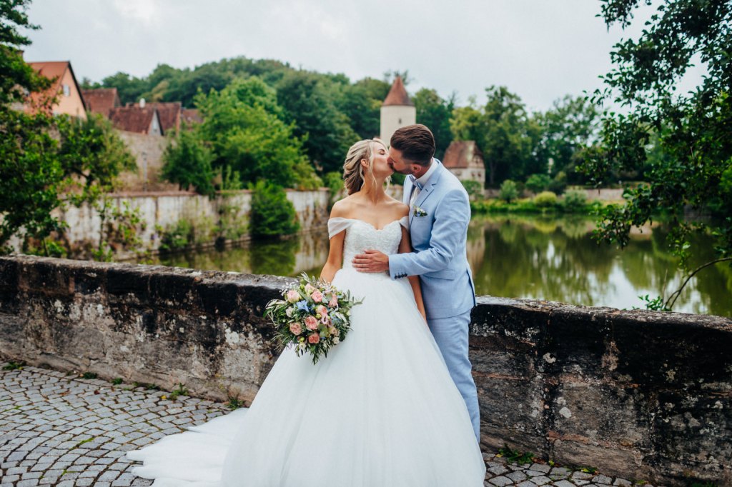 Über das Wetter machten wir uns beim Vorgespräch keine Gedanken, was soll da schon schief gehen, gerade im Juli passt das Wetter ja eigentlich immer. Leider nicht in diesem Jahr – schon Tage davor war abzusehen, dass es vormittags regnen sollte und das war schade, denn die beiden hatten einen First Look direkt vor der Trauung geplant. Dieser sollte im Spitalhof in Dinkelsbühl statt finden. Ein wirklich schöner Ort für erste Bilder vom Brautpaar, nur leider machte uns der Regen einen Strich durch die Rechnung. So verlegten wir das erste Aufeinandertreffen von Madeleine & Jannis schweren Herzens kurzerhand in den Vorraum der Heilig Geist Kirche.