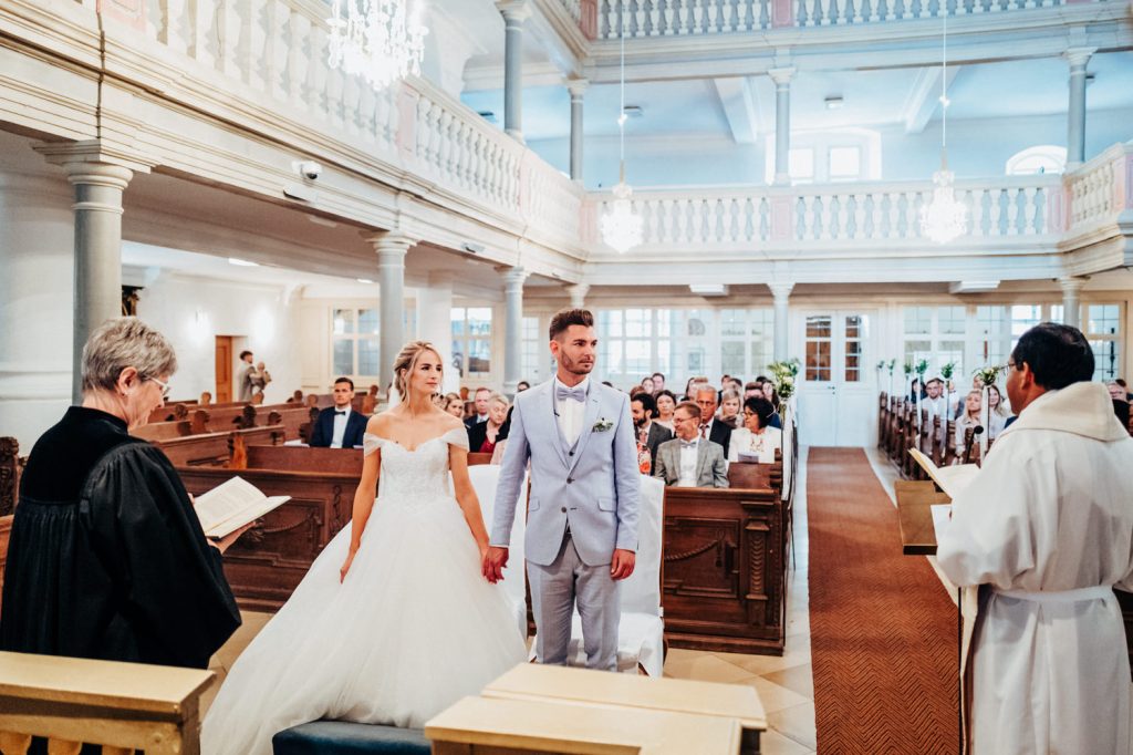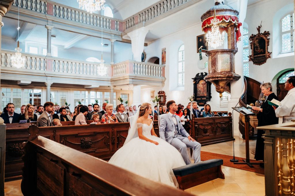 Alle Gäste nahmen bereits vorab Platz in der Kirche und Robert, der als Videograf gebucht war, und ich platzierten Jannis in der Nähe eines Fensters, um möglichst viel Licht auf das Brautpaar zu bekommen an diesem (morgens noch so) trüben Tag.