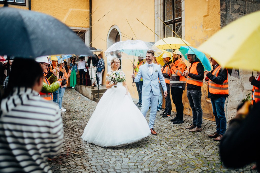 Nach der Trauung ging es durch den Seiteneingang aus der Kirche, wo bereits zahlreiche KollegInnen der beiden mit Regenschirmen geschützt warteten.