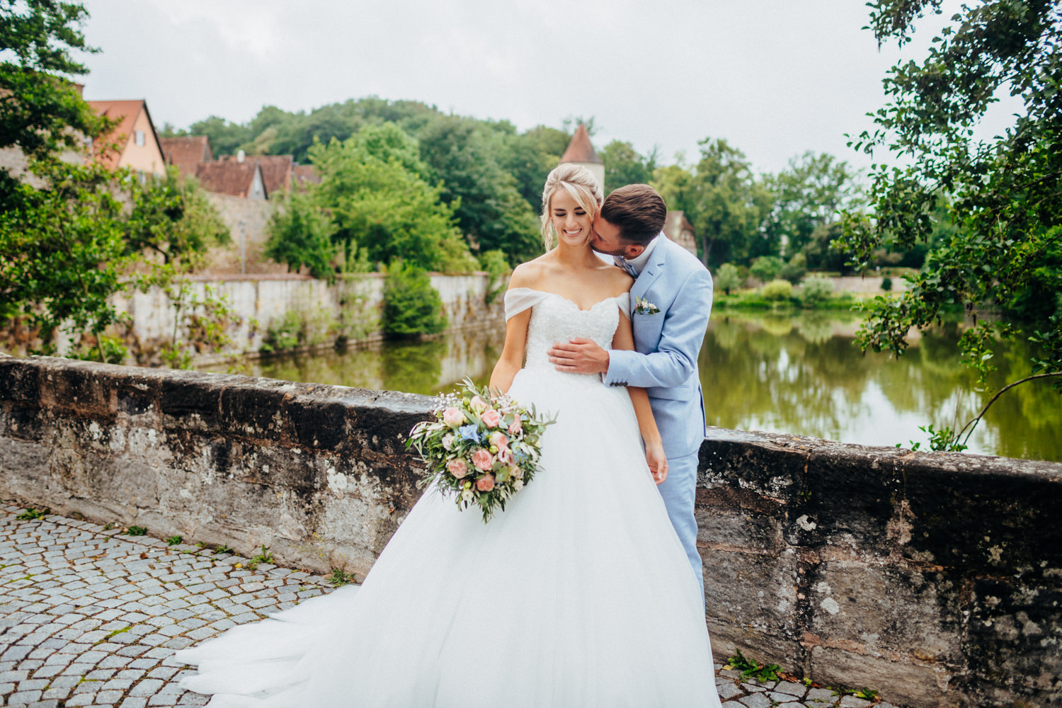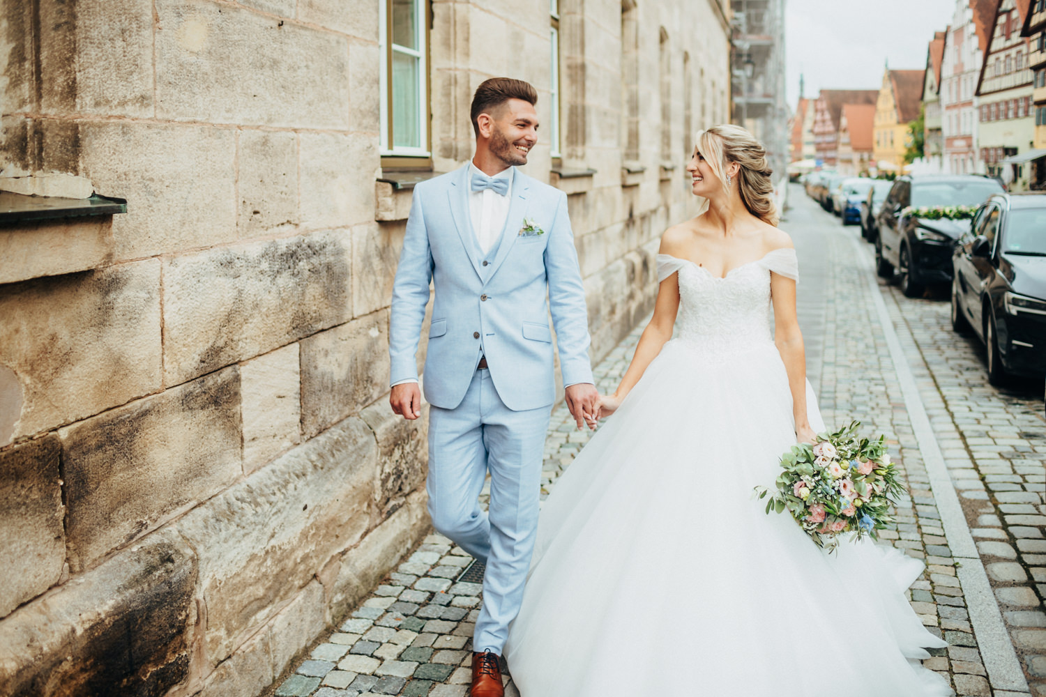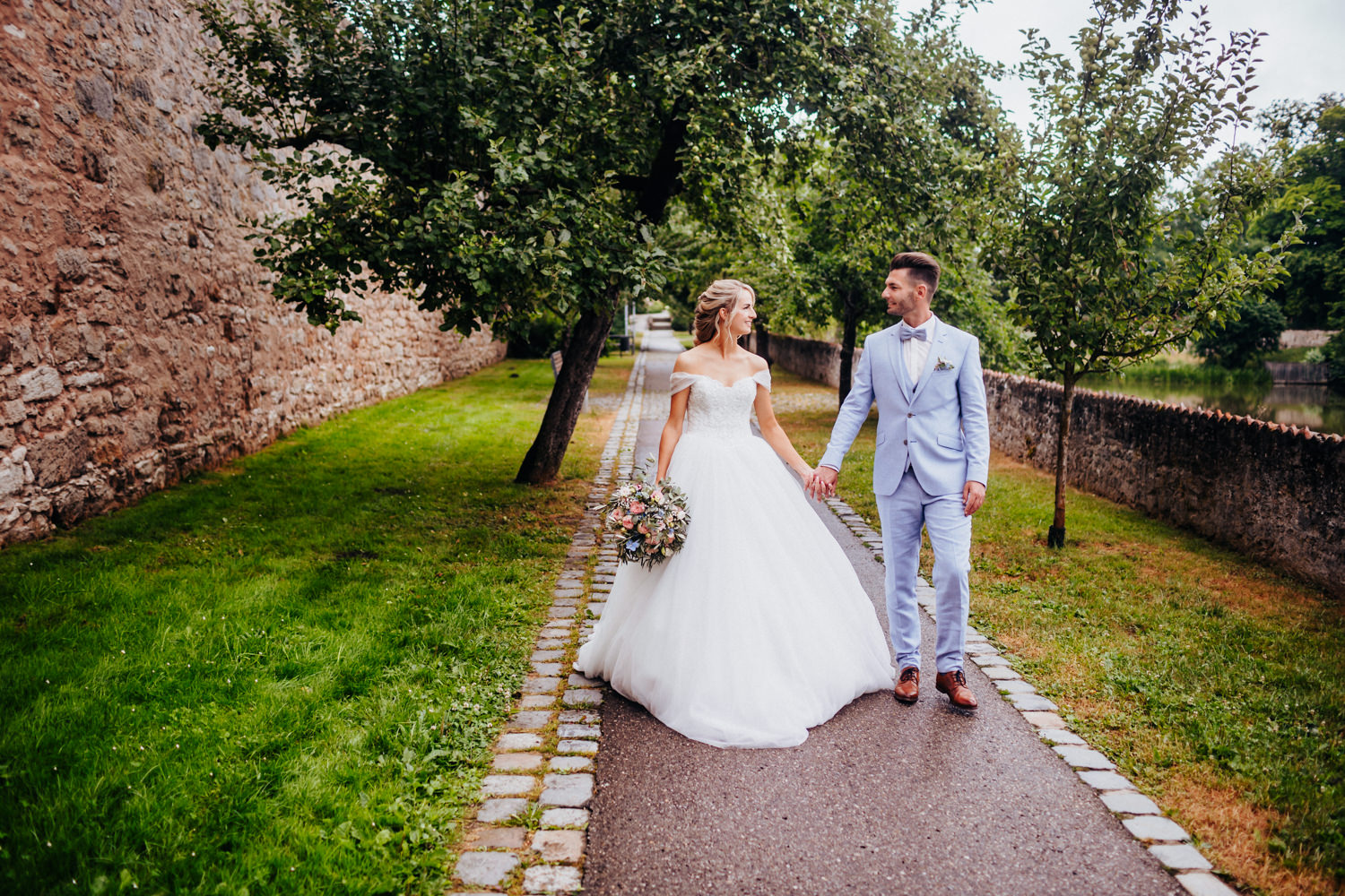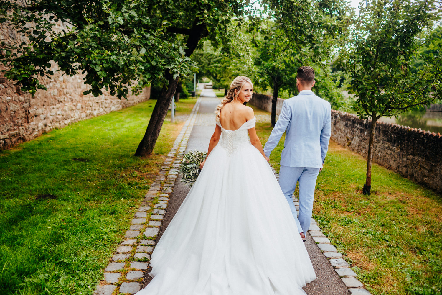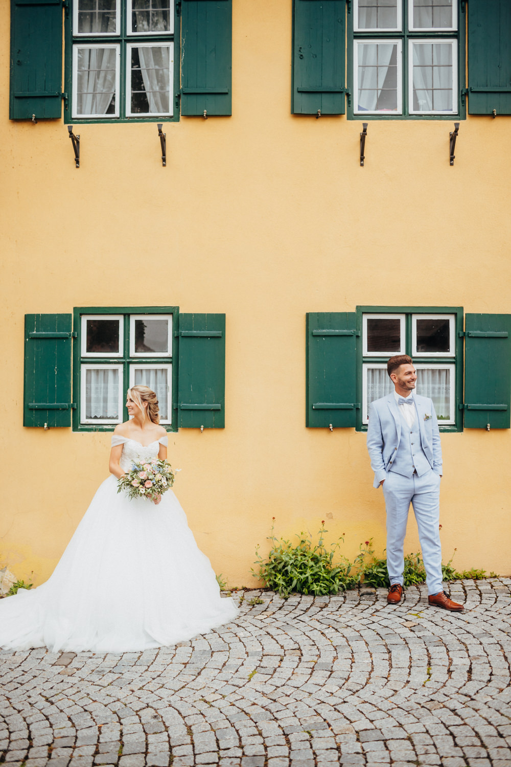 Über das Wetter machten wir uns beim Vorgespräch keine Gedanken, was soll da schon schief gehen, gerade im Juli passt das Wetter ja eigentlich immer. Leider nicht in diesem Jahr – schon Tage davor war abzusehen, dass es vormittags regnen sollte und das war schade, denn die beiden hatten einen First Look direkt vor der Trauung geplant. Dieser sollte im Spitalhof in Dinkelsbühl statt finden. Ein wirklich schöner Ort für erste Bilder vom Brautpaar, nur leider machte uns der Regen einen Strich durch die Rechnung. So verlegten wir das erste Aufeinandertreffen von Madeleine & Jannis schweren Herzens kurzerhand in den Vorraum der Heilig Geist Kirche.