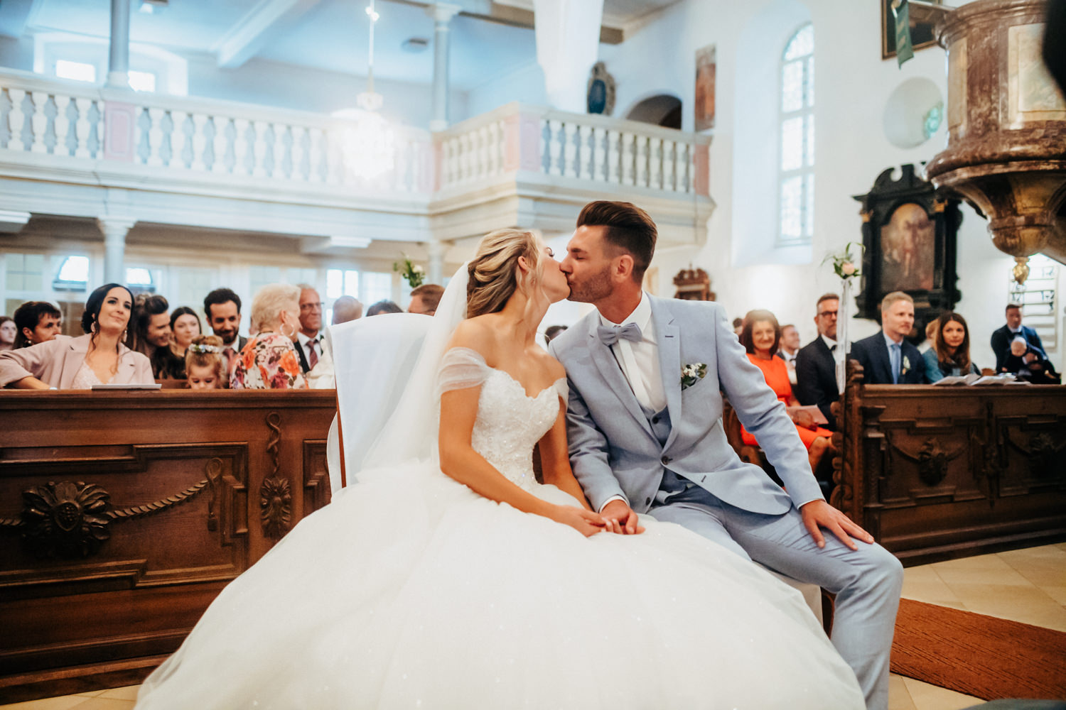 Alle Gäste nahmen bereits vorab Platz in der Kirche und Robert, der als Videograf gebucht war, und ich platzierten Jannis in der Nähe eines Fensters, um möglichst viel Licht auf das Brautpaar zu bekommen an diesem (morgens noch so) trüben Tag.