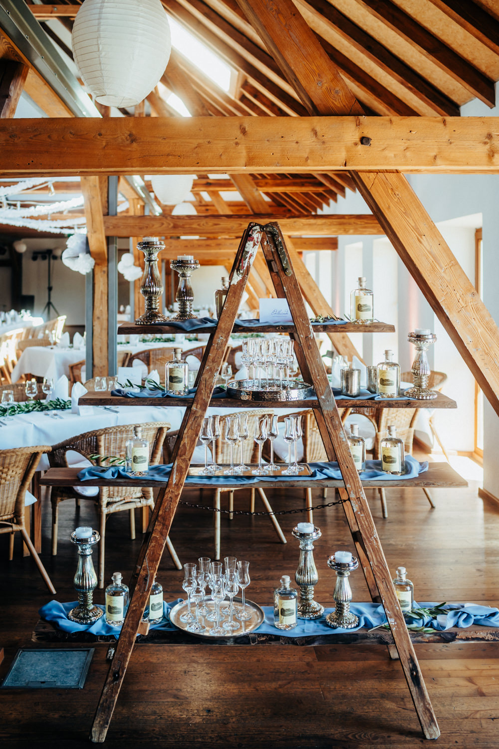 Für die Feier ging es dann weiter in den zauberhaften Alten Obstkeller nach Mönchberg. Bei bestem Wetter fand das Kaffee trinken im Freien unter großen, weißen Sonnenschirmen auf der schön dekorierten Apfelbaumwiese statt. Sogar für eine Hüpfburg für die kleinen Gäste war gesorgt. Die Tische im Saal waren passend zum Brautstrauß und zur Hochzeitstorte mit Olivenzweigen dekoriert und so fand jeder Gast dank des schönen Sitzplans seinen Platz.