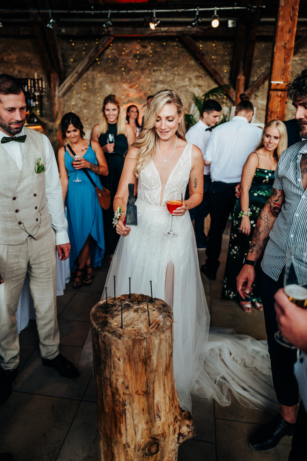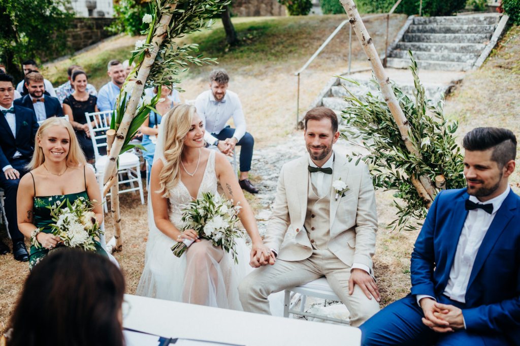Die anschließende Trauung von Janine & Marc fand im Freien statt. Auch hier war wieder alles perfekt dekoriert und in Szene gesetzt. Nach der Trauung warteten bereits die Kolleg*innen der beiden und es mussten zwei Aufgaben bewältigt werden.