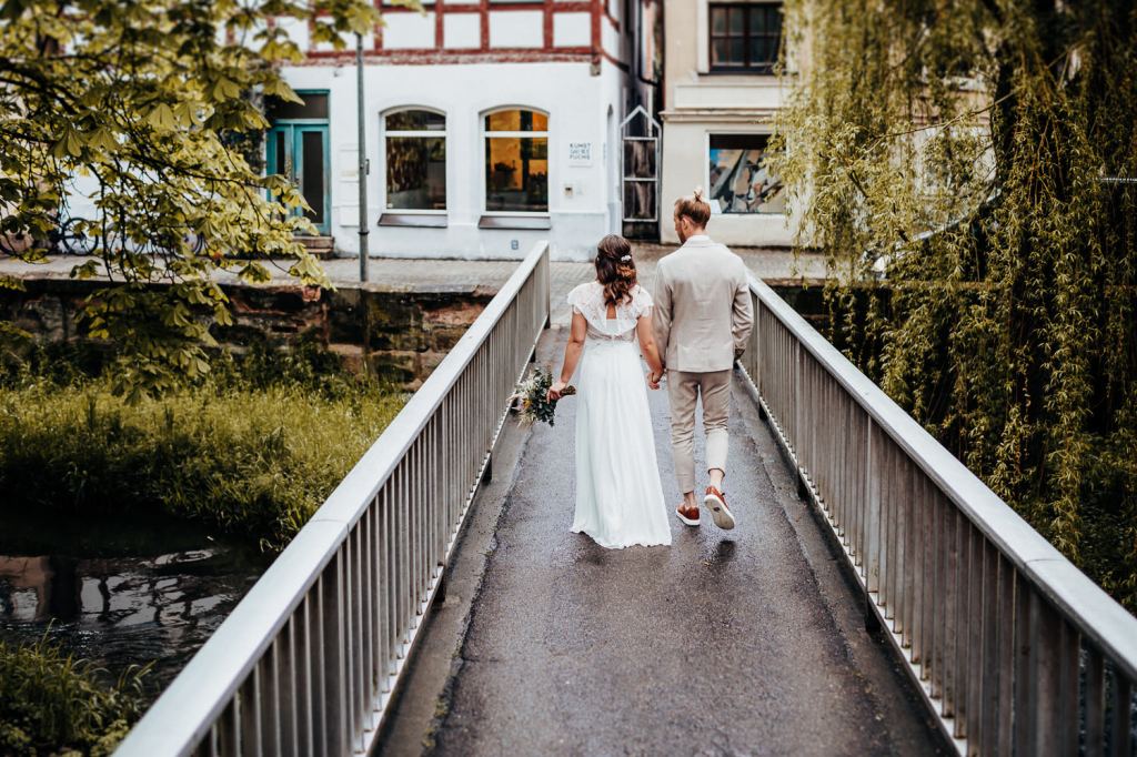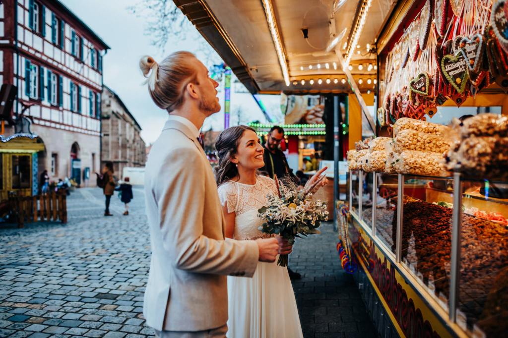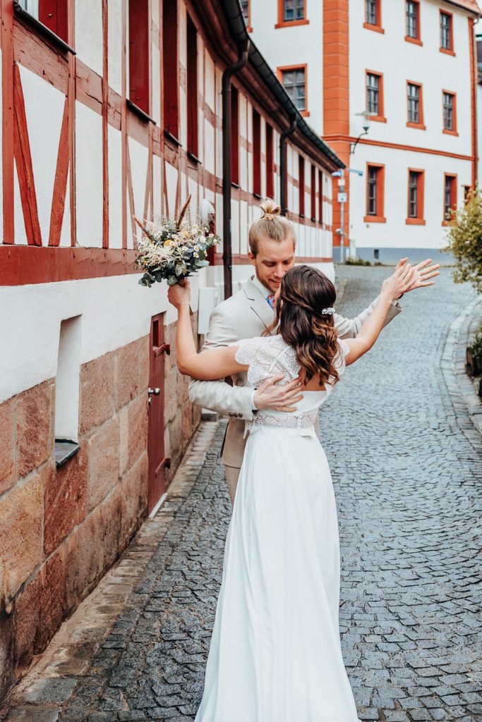 Der Tag begann mit einem kleinen Fotoshooting in der bezaubernden Altstadt von Schwabach. Die engen Gassen und tollen Fachwerkhäuser bildeten eine zauberhafte Kulisse für die Aufnahmen. Aber es war nicht nur die Altstadt, die an diesem Tag ihre Tore öffnete – es war auch das Volksfest, das die Straßen mit fröhlichem Treiben füllte. Stephi und Jojo nutzten diese Atmosphäre für ein paar besondere Fotos.