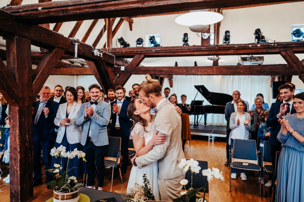 Nach dem Fotoshooting machte sich die gesamte Gesellschaft auf den Weg zum Bürgerhaus II in Schwabach, wo die standesamtliche Trauung stattfand. Das historische Gebäude strahlte einen ganz eigenen Charme aus und bot den perfekten Rahmen für den offiziellen Teil der Hochzeit. Unter den liebevoll dekorierten Bögen und dem sanften Licht des Saals gaben sich Stephi und Jojo das Ja-Wort.