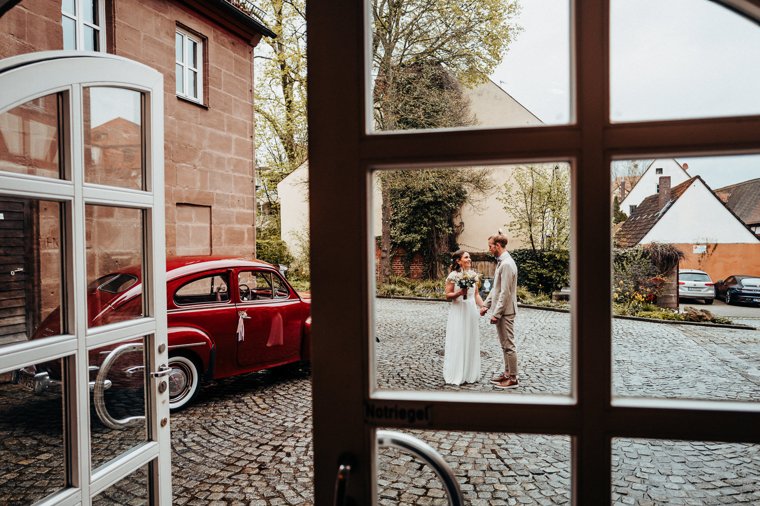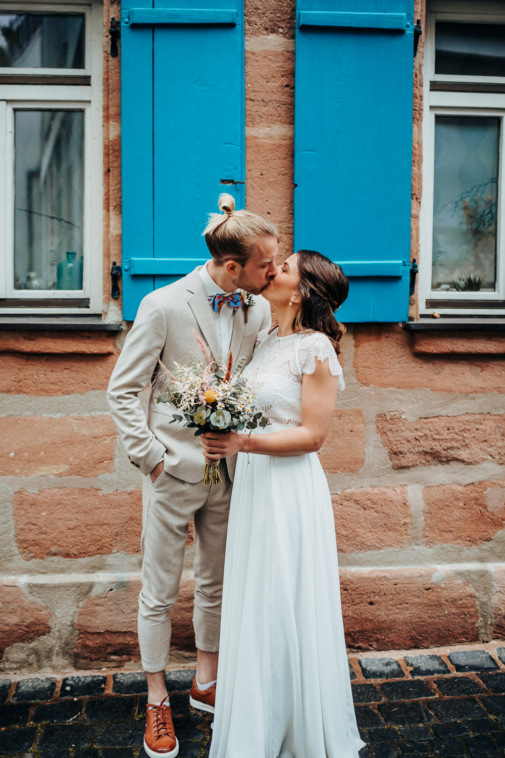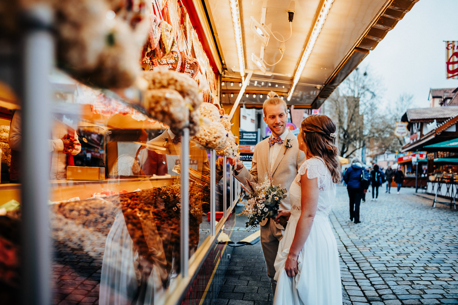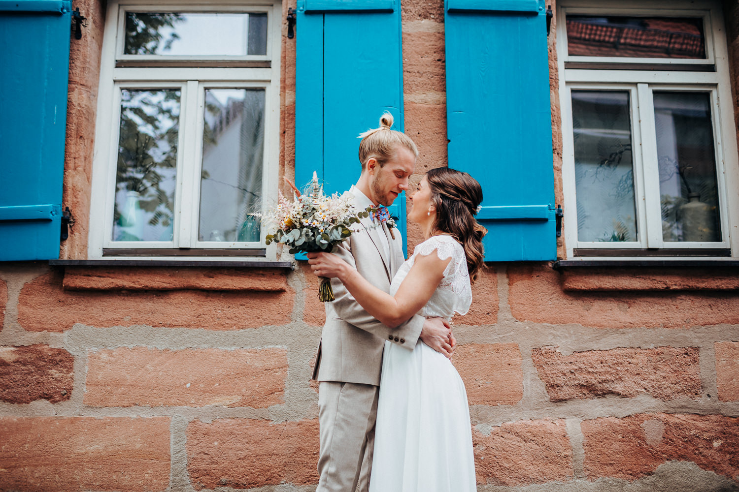 Der Tag begann mit einem kleinen Fotoshooting in der bezaubernden Altstadt von Schwabach. Die engen Gassen und tollen Fachwerkhäuser bildeten eine zauberhafte Kulisse für die Aufnahmen. Aber es war nicht nur die Altstadt, die an diesem Tag ihre Tore öffnete – es war auch das Volksfest, das die Straßen mit fröhlichem Treiben füllte. Stephi und Jojo nutzten diese Atmosphäre für ein paar besondere Fotos.