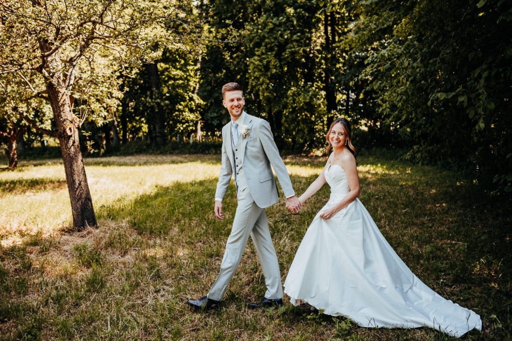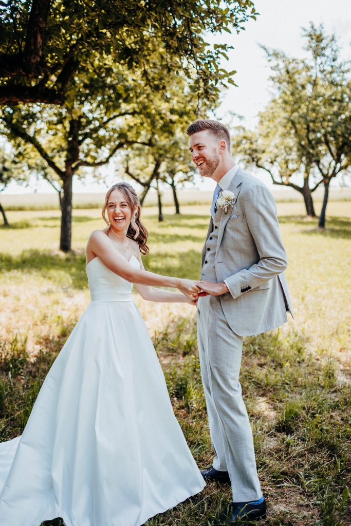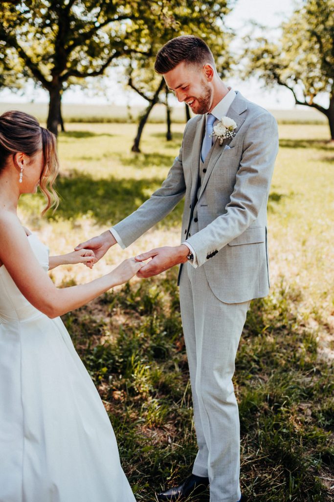 Nachdem beide aufgeregt auf ihren großen Moment hingefiebert hatten, trafen sich Vicky und Daniel zum ‚First Look‘ an einem Waldstück in der Nähe des Winzerhofs. Ein wahnsinnig schöner Moment, wenn sich das Brautpaar das erste Mal vorbereitet für den großen Tag sieht.