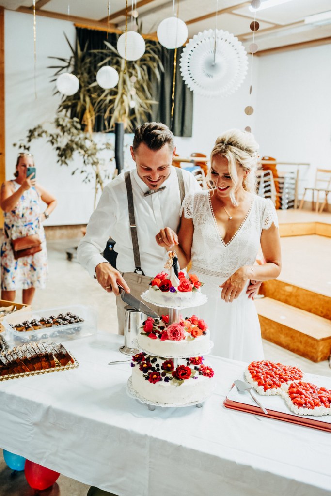 Der krönende Abschluss dieses heißen Tages war die Feier in Gebsattel. Die Location wurde von den beiden (und den vielen fleißigen Helfern) perfekt für eine grandiose Party vorbereitet. Nach dem leckeren und üppigen Kuchenbuffet wurden die Gäste noch von einem Bio-Buffet vom Gasthof Fetz aus Götteldorf verwöhnt, bevor die große Party starten konnte.