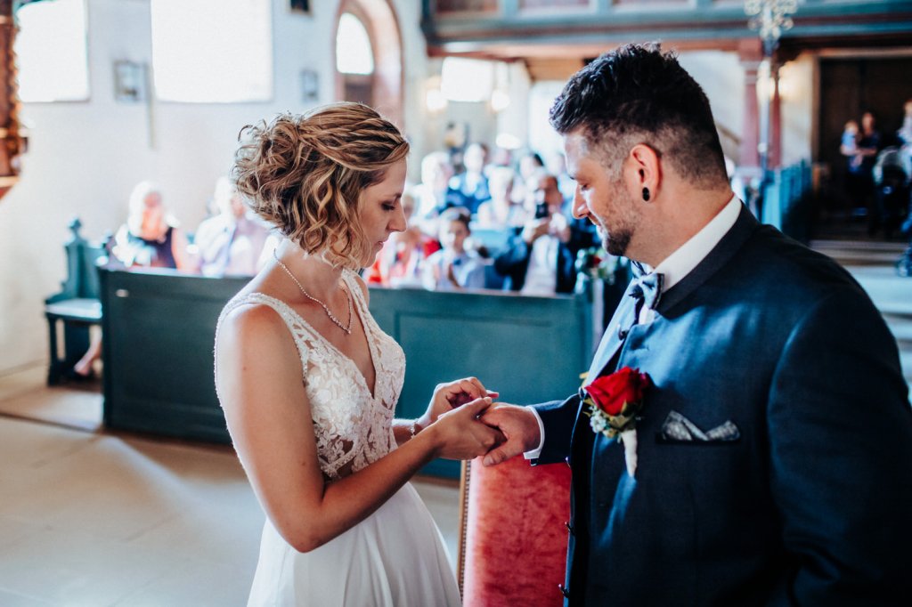 Danach ging es für uns weiter zur Kirche in Detwang, wo die offizielle Trauung stattfand. Die historische Kirche sorgte für eine stimmungsvolle Atmosphäre, als Steffi und Markus ihre Liebe vor ihren Familien und ihren Freunden bekräftigten.